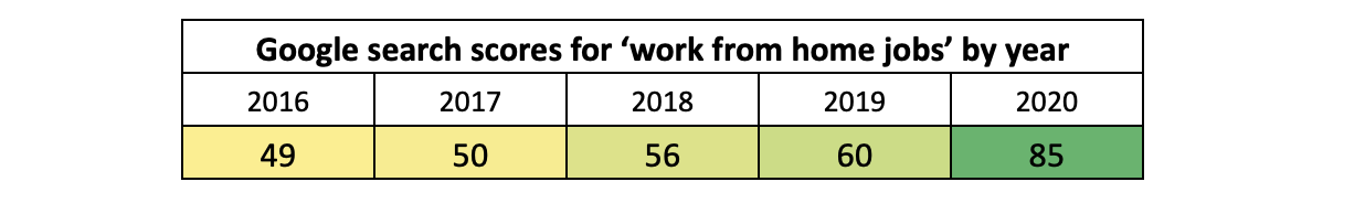 Remote working has become a more popular option for people in recent years. Even before the pandemic, Google searches for ‘work from home jobs’ had seen a steady increase. Between 2016 and 2019, searches for this term increased by 22 percent. By 2020, this rose to 73 percent over the past five years. Google search scores represent the popularity of a search term based on a scale of 0 to 100. In 2016, this score was 49. Last year, the score had an average popularity score of 85.