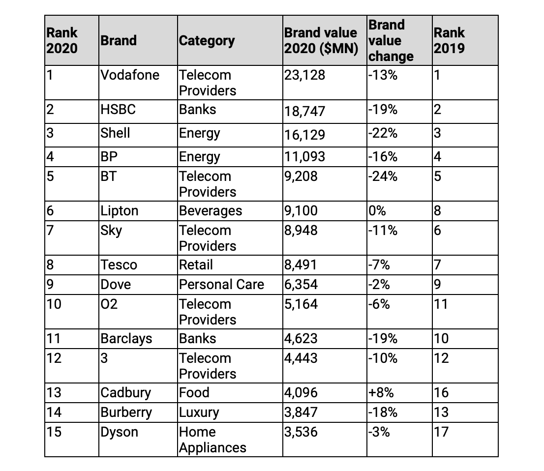 The top five most valuable UK brands remained unchanged. Vodafone (-13%, $23.1bn; £18.9bn), which recently announced its intention to float its mobile towers business in a deal that could be worth £18bn, maintained its no.1 spot for the third year running. HSBC (-19%; $18.7bn; £15.3bn) and Shell (-22% $16.1bn; £13.1bn) make up the top three respectively.